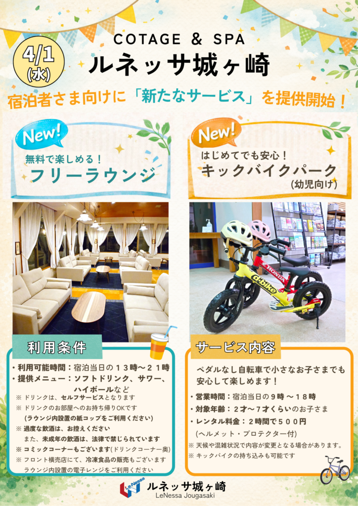 また新たに、小さなお子様向けの『キックバイクパーク』も敷地内にオープンいたしました!ペダルなし自転車を2時間500円でレンタル可能です。もちろんご自身のキックバイクお持ち込みもOKです。