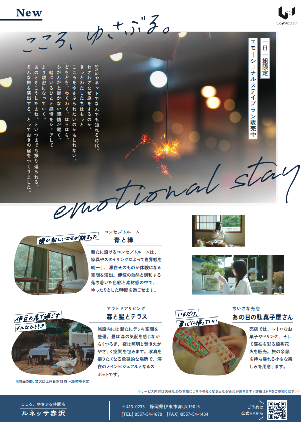 ホテル伊豆急の姉妹館・伊豆高原の宿泊施設「ルネッサ赤沢」では、本年で開業 40 周年を迎えるにあたり、施設の一部リニューアルを実施いたしました。これに伴い、新コンセプト「こころ、ゆさぶる。emotional stay」を体感していただける『1 日 1 組限定/エモーショナルステイプラン』の販売を開始いたしました。